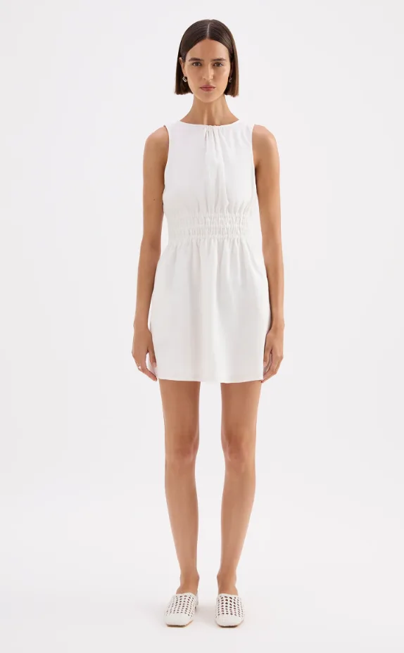 The Andri Linen Mini Dress is made from premium linen fabrication with a breathable, soft hand feel. This mini dress features a high boat neckline, shirred elastic waist, side seam pockets, invisible zipper at back and gathers at front neck.