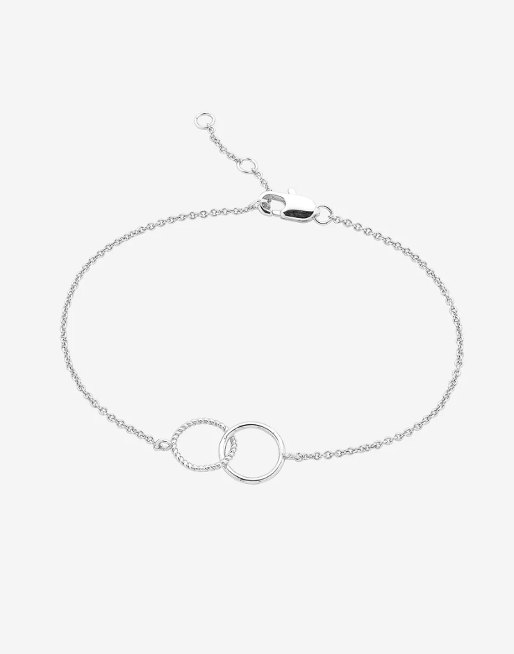 A delicate chain bracelet featuring interlinked circles, one plain, one textured. Perfect way to gift your bestie or loved one or yourself. Easy layering piece.