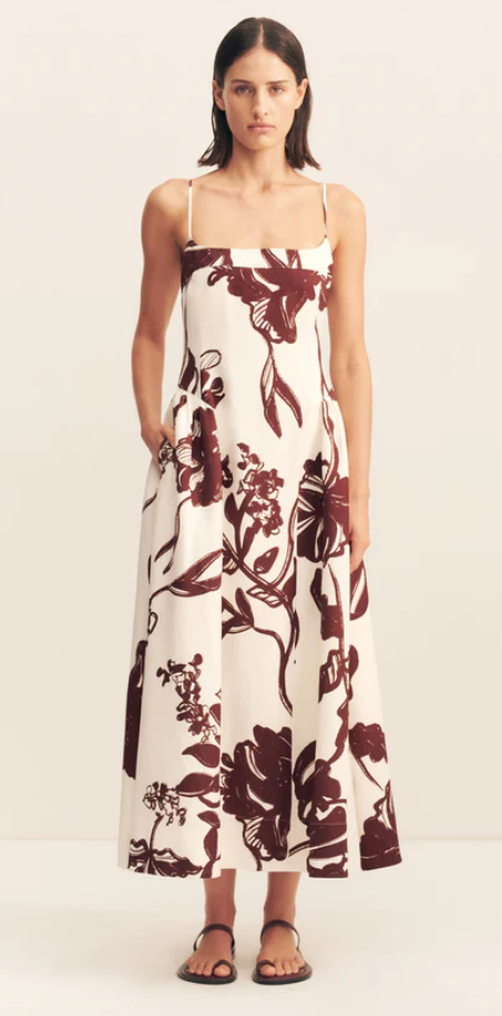 Square neck panelled midi dress in a premium linen blend in the redwood wallpaper print.