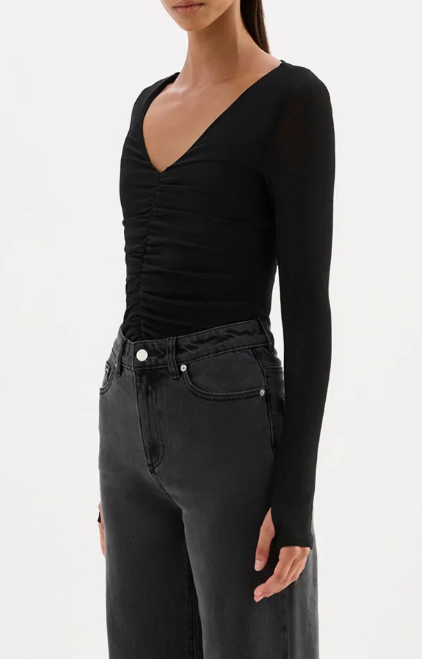 The Gigi Mesh Top is made from a stretch jersey fabrication that has a dry, lightweight hand feel. This long sleeve top has a figure hugging silhouette. Features include V neckline, soft gathers through centre of body and thumb holes. This top is lined through body.