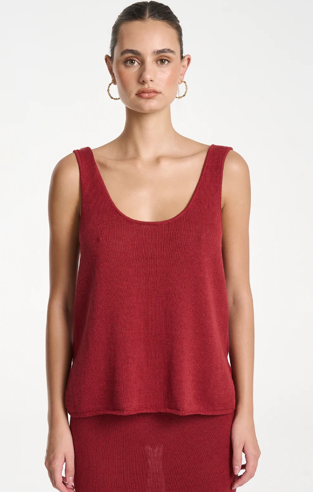 The Knit Tank is an elegant classic shape crafted from a lightweight linen/cotton blend in carmine red.