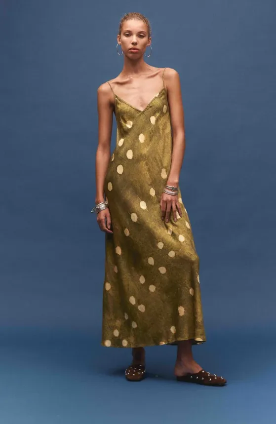 Slip into it and go. Light, fluid, and barely there. The silhouette skims the body before falling into a soft, easy drape, moving quietly with every step.