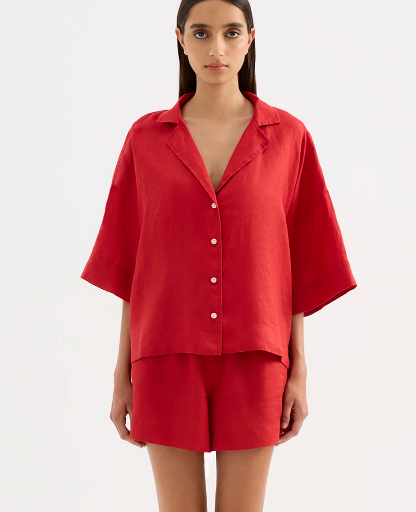 The Lounge Linen Shirt is made in a premium 100% organic French linen which has been washed down for a soft and breathable handfeel. The silhouette is a classic shape, with a clean and casual fit. Features include a wide collared neckline, button front opening and wide elbow length sleeves. This shirt also includes the Nude Lucy branded label. Pair with a Nude Lounge Bottom in coordinating colours.