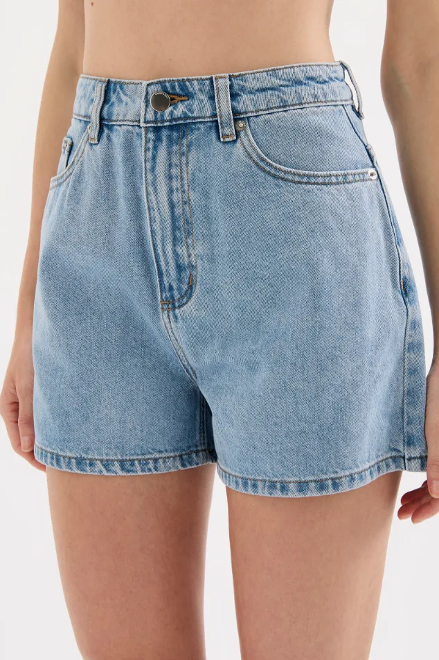 The Organic Mom Short is made from 12 oz 100% organic cotton denim, stone washed to an authentic stone wash blue. The silhouette is a classic high rise with relaxed leg and mini in length. Features include branded shank button, rivets & Jacron Back patch. Fits true to size, size up for a more relaxed fit.