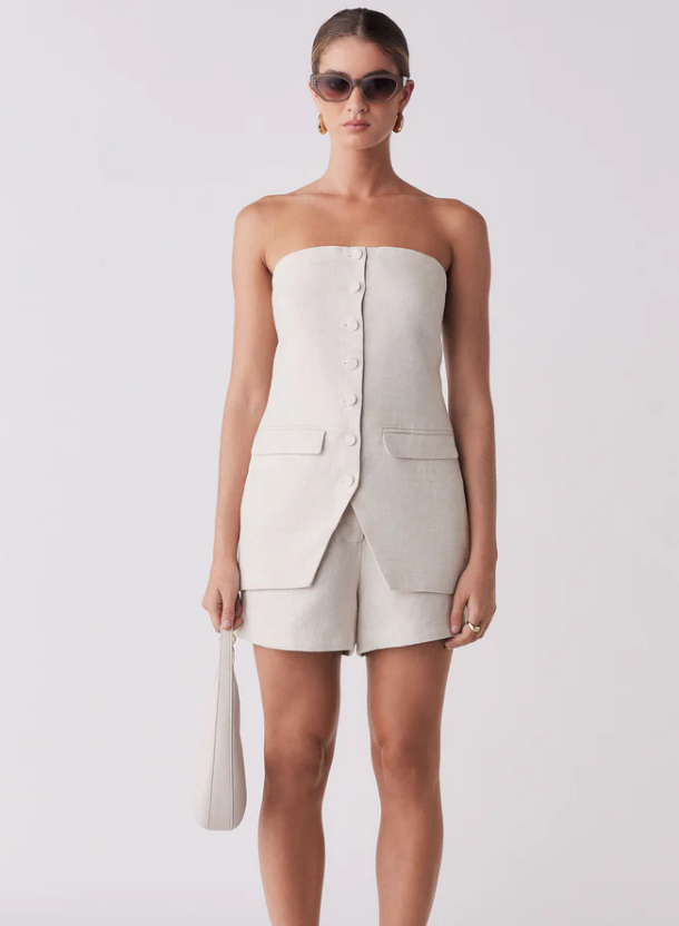 Esmaee Portsea Bandeau • Natural linen fabrication • Bandeau neckline • Bust darts • Functional button opening at center front • Front flap pockets • Mindfully created • Hip length