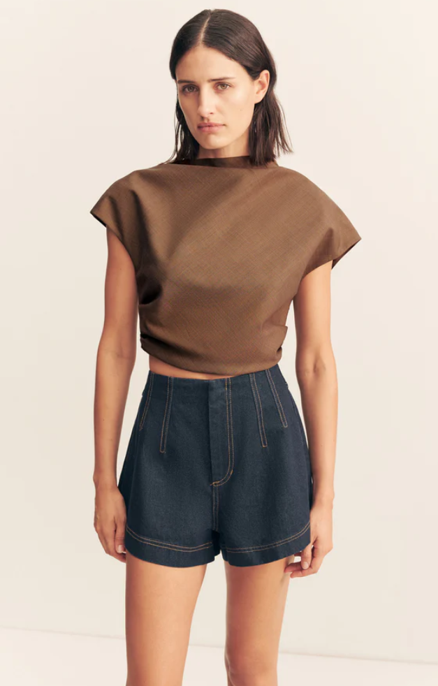 Mid rise flared short in a dark wash denim with contrast stitching.