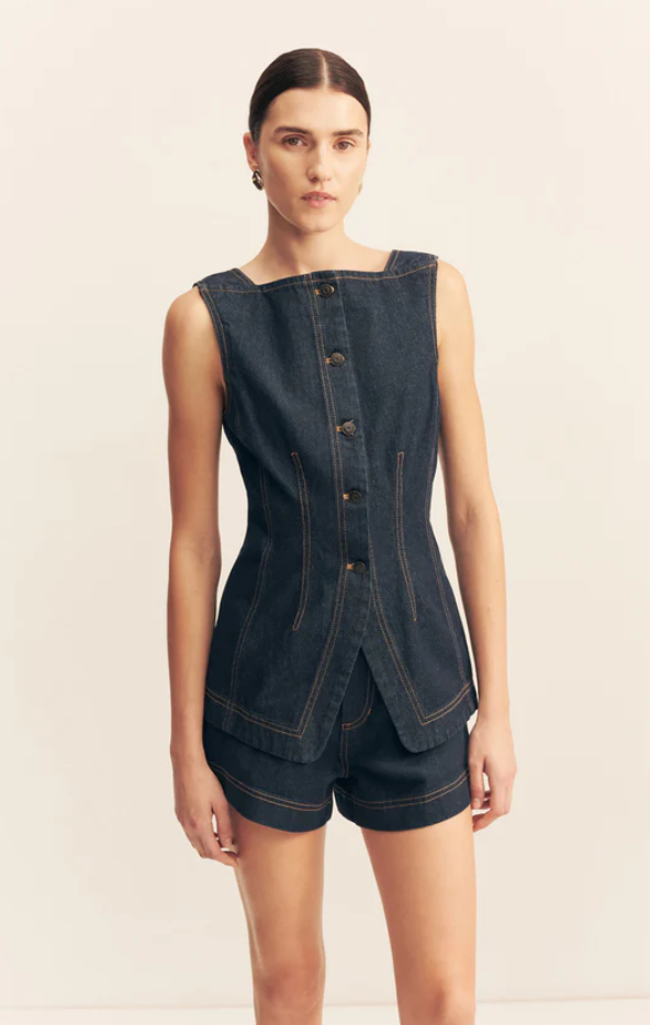 High square neck vest in a dark wash denim with contrast stitching.