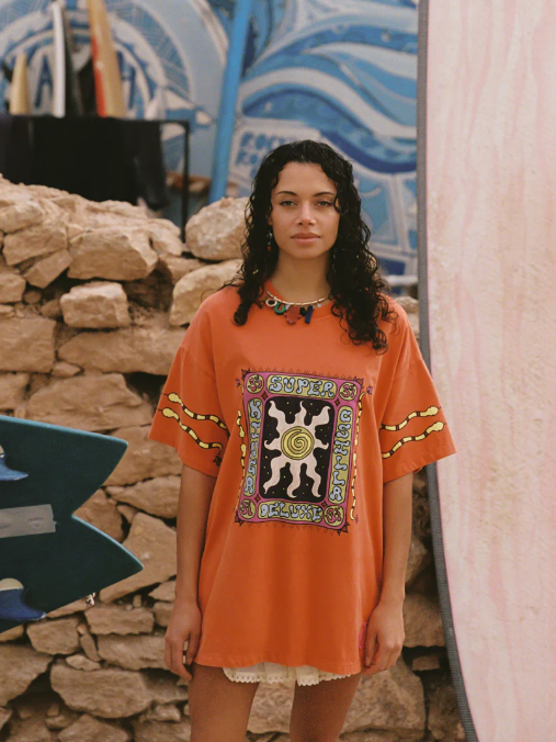 With hand-drawn sun motif in crackle print plus a washed orange base adds to the vintage feel, giving the tee a lived-in, collectible quality.