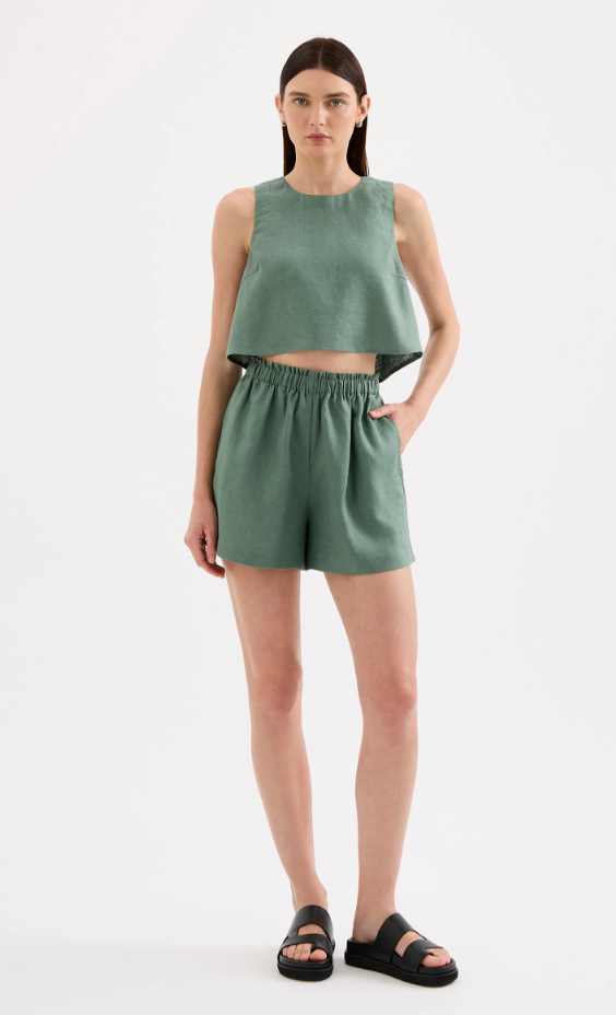 The Theo Linen Short is made from 100% Linen which has been washed for a soft, breathable hand feel. The silhouette is a high waisted clean casual fit with a wide leg opening. Features include an elasticated paper bag waistband and side seam pockets.