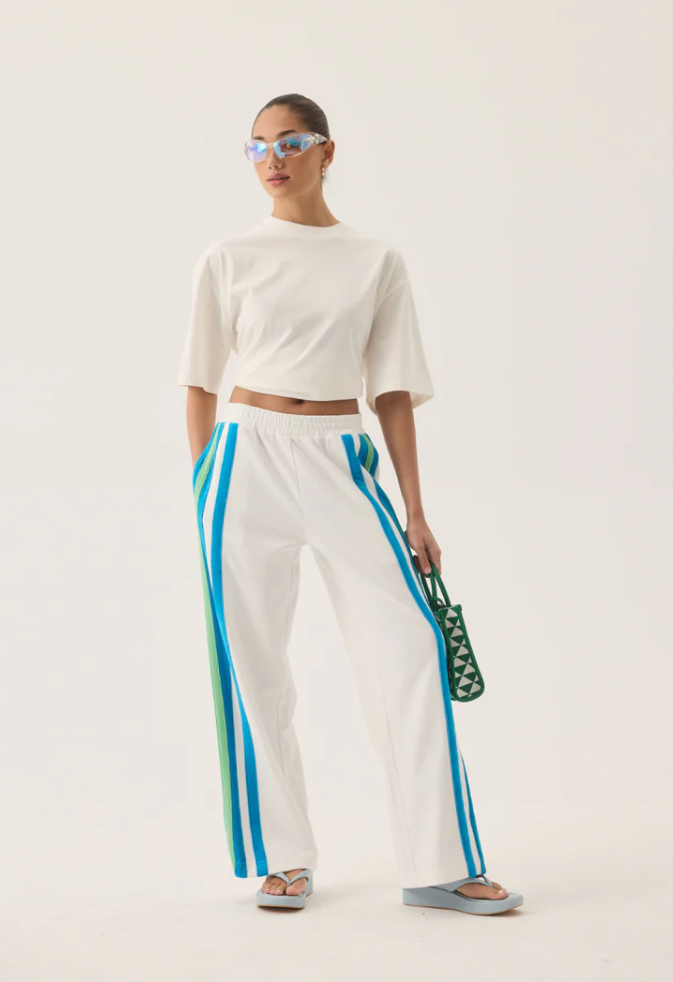 The Vacation Sporty Pant in Snow is the wider-leg casual pant you've been looking for. Cut in a luxe sports sheen fabric, this style features side pockets, and contrasting velour trims that elongate the leg. With an elasticised waistband, this pant is both flattering and comfortable. Pair yours with the Dolphine Tank in French Blue or Tropical Green, and your fave slides for a relaxed everyday look.